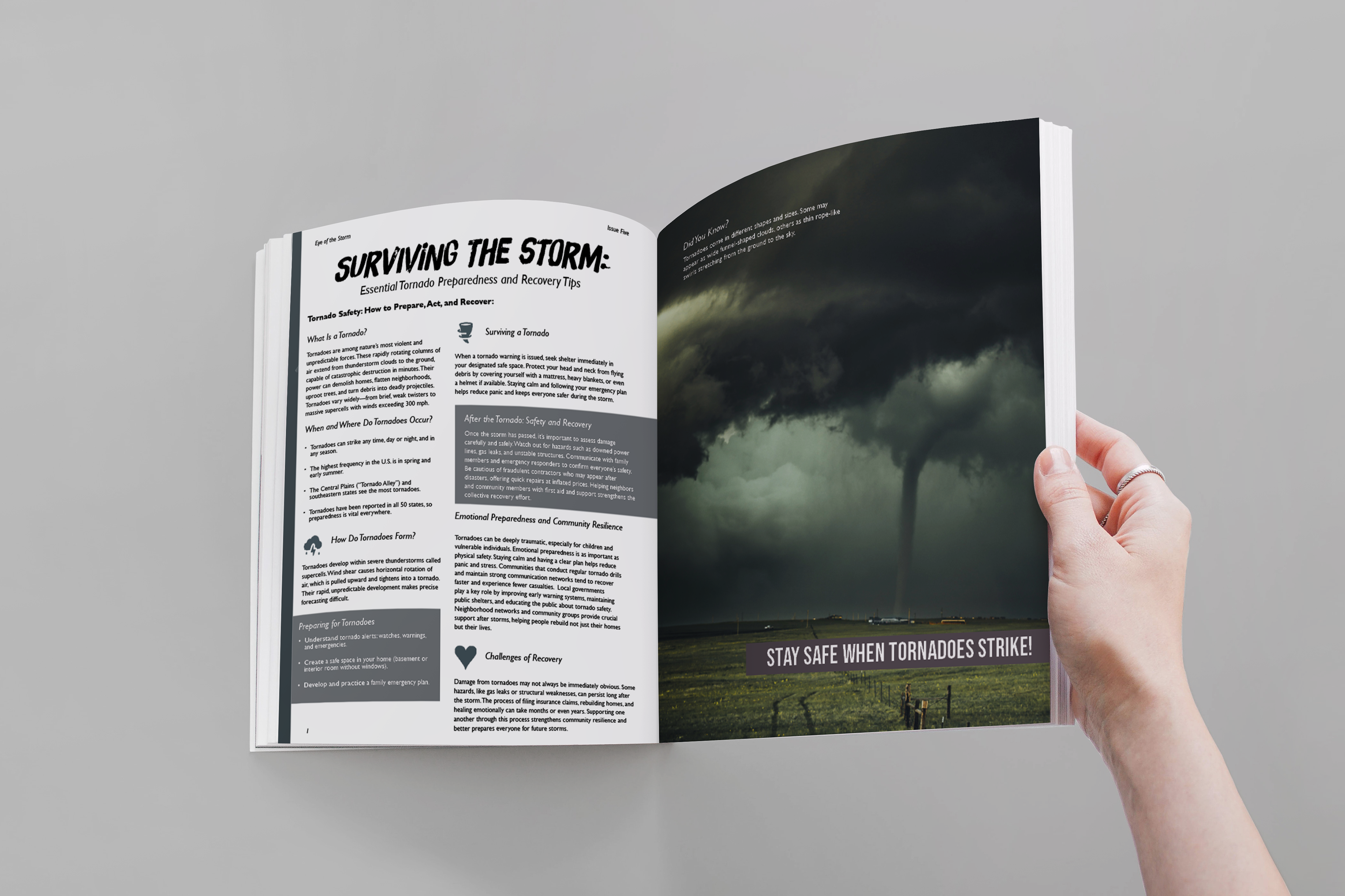 This editorial spread focuses on tornado safety and awareness, combining strong visuals with clear, organized information. I wanted to create something that feels both serious and engaging, so I used a dramatic storm image to immediately grab attention and set the tone. The layout is structured to guide the reader through important safety tips in a way that’s easy to follow, using hierarchy, icons, and contrasting sections to break up the text.